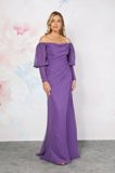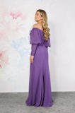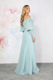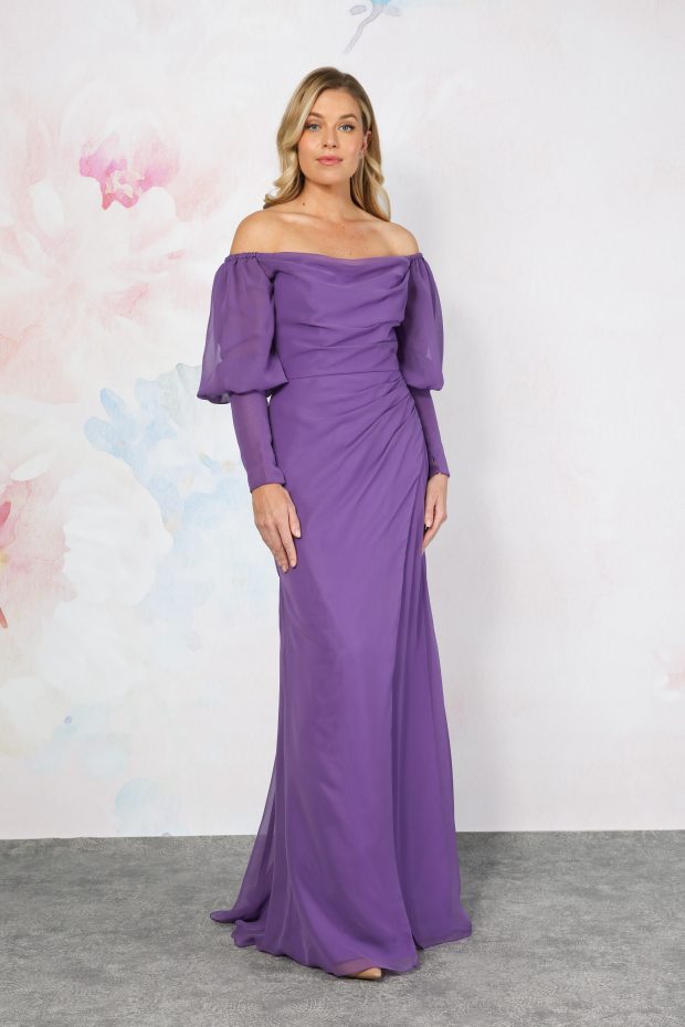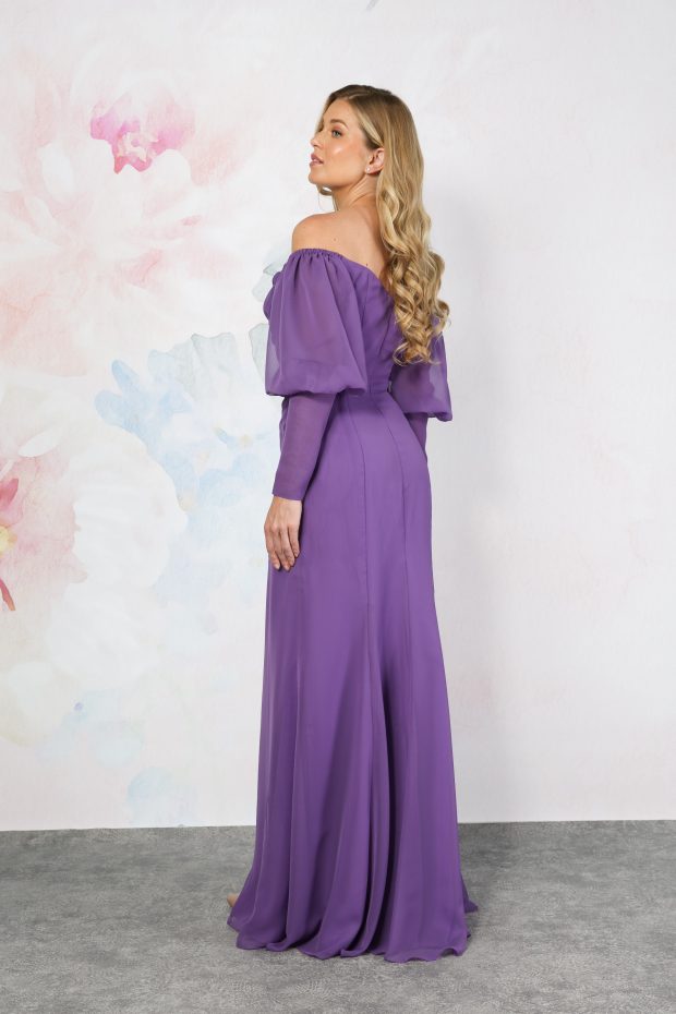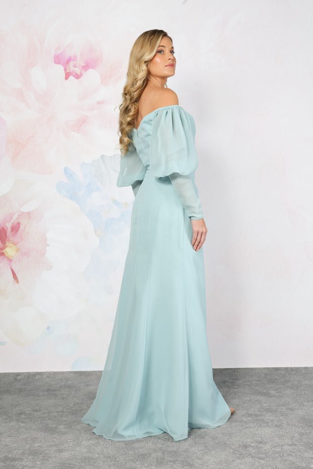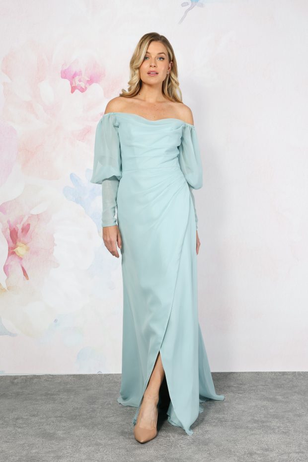 A stunning chiffon bridesmaid dress with bardot neckline to highlight your decolletage. The pretty off-the-shoulder puff sleeves drape over the tops of the arms, down into two long fitted cuffs. The bodice of the dress has clever draping that highlights your silhouette. The skirt is a chiffon wrap-over style to complete this pretty dress.